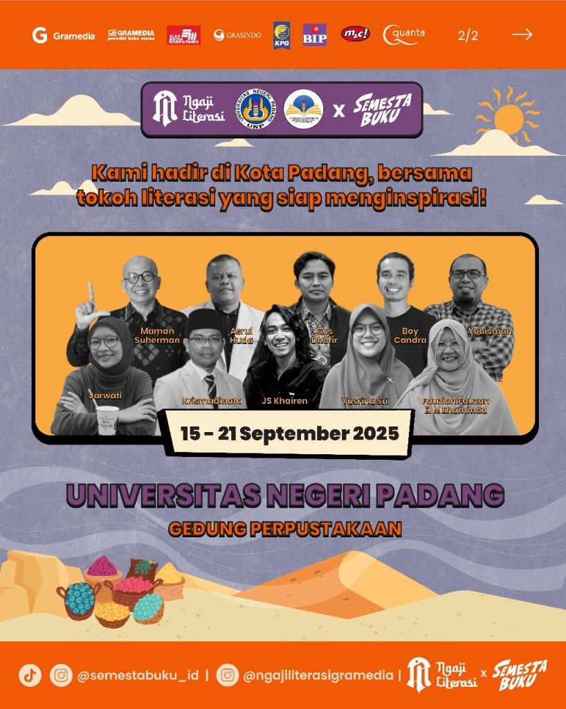 Padang, 15 September 2025 – Gerakan literasi di Sumatera Barat semakin hidup dengan hadirnya acara NgajiLiterasi x Semesta Buku x UNP, hasil kolaborasi antara NgajiLiterasi, Semesta Buku, dan Universitas Negeri Padang (UNP).